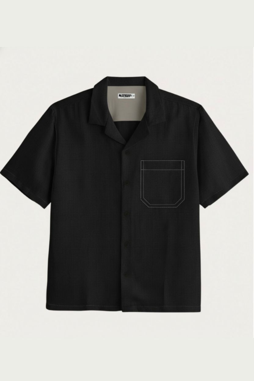 - Cuban collar and half sleeves with patch chest pocket in off-white stitching bringing a vacation-ready vibe