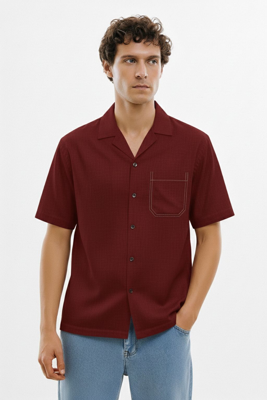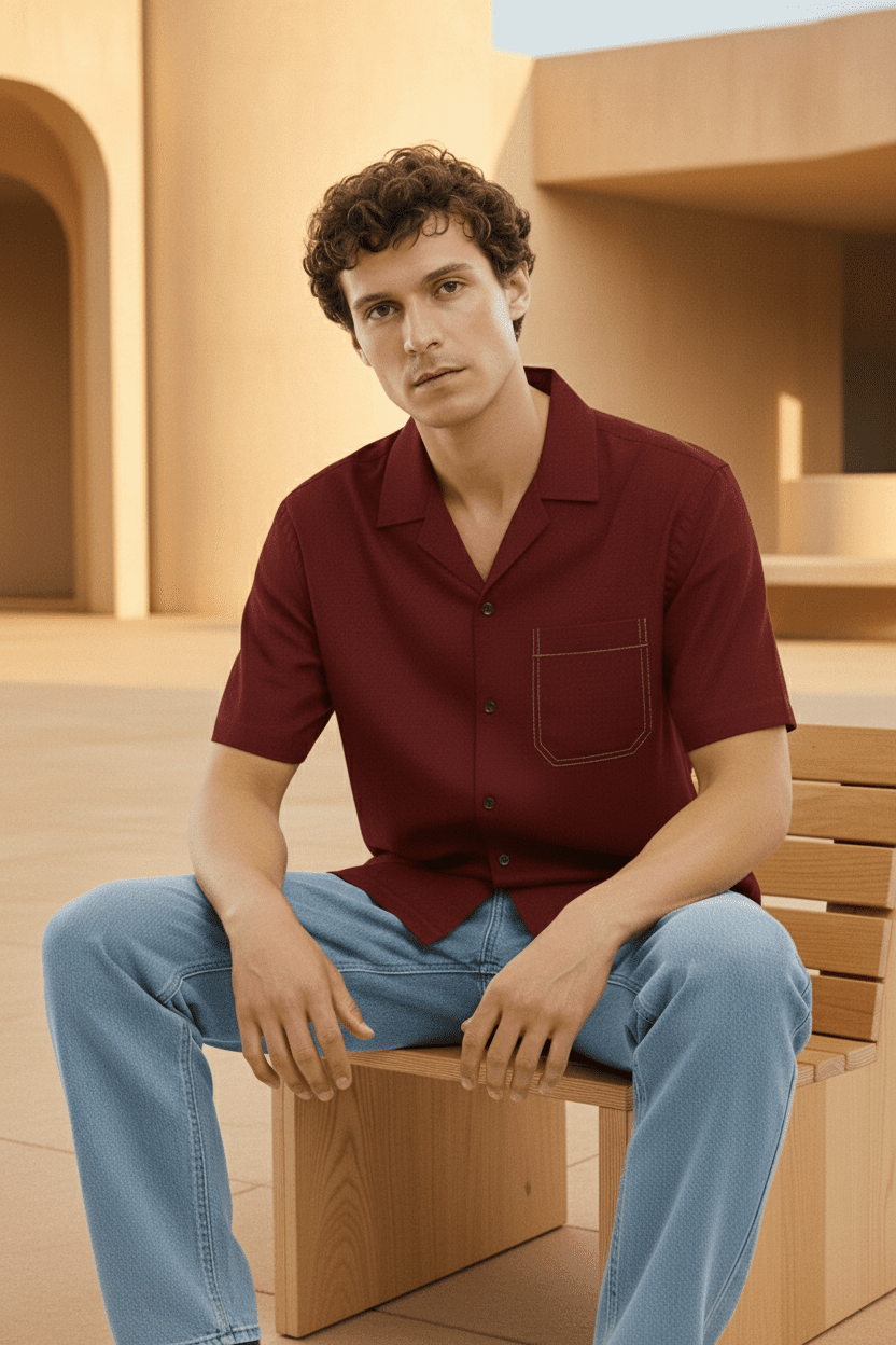 - Rich deep-maroon tone with patch chest pocket for a bold yet refined look