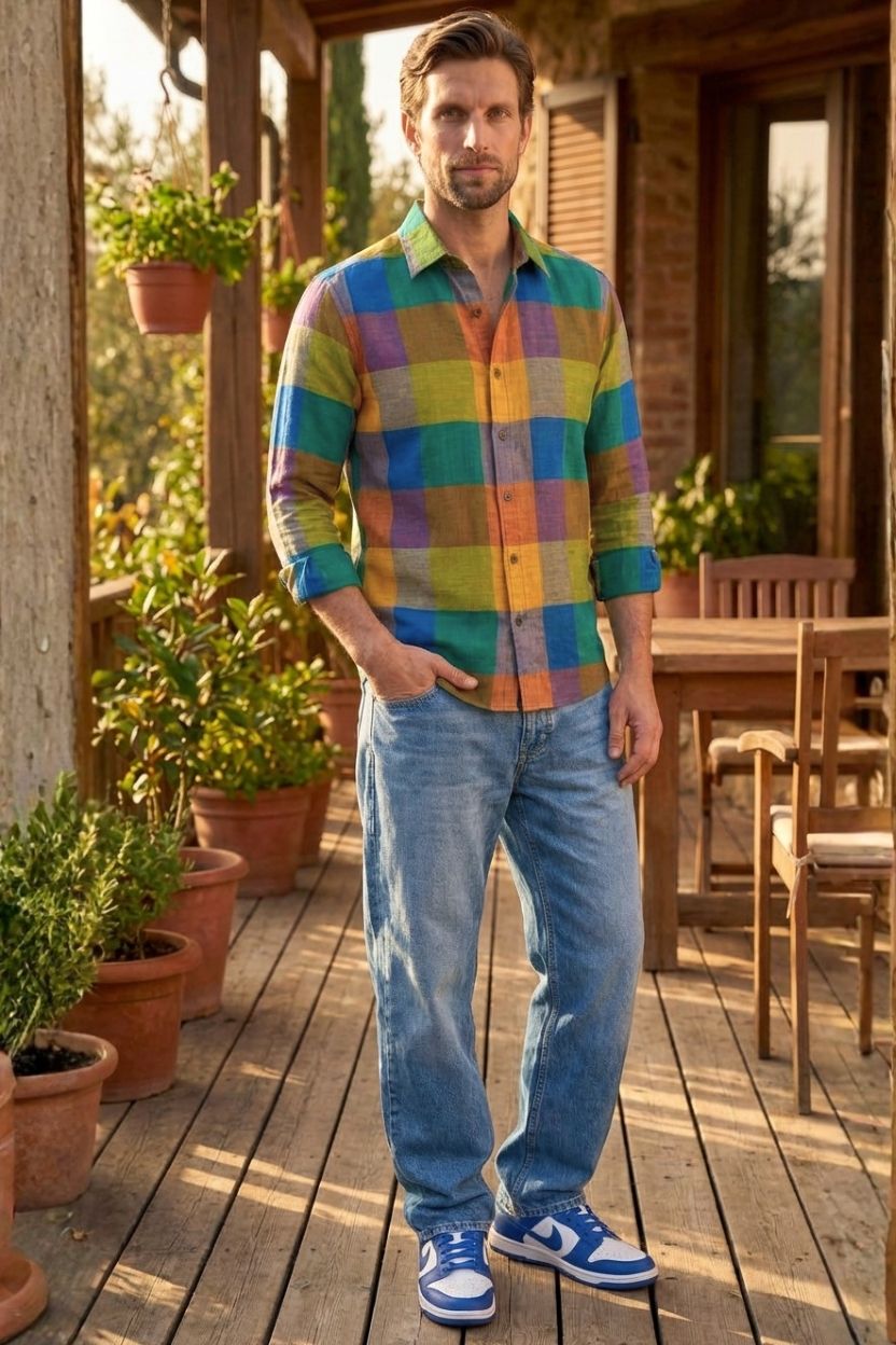 - Bold multicolor check pattern for a statement yet versatile look