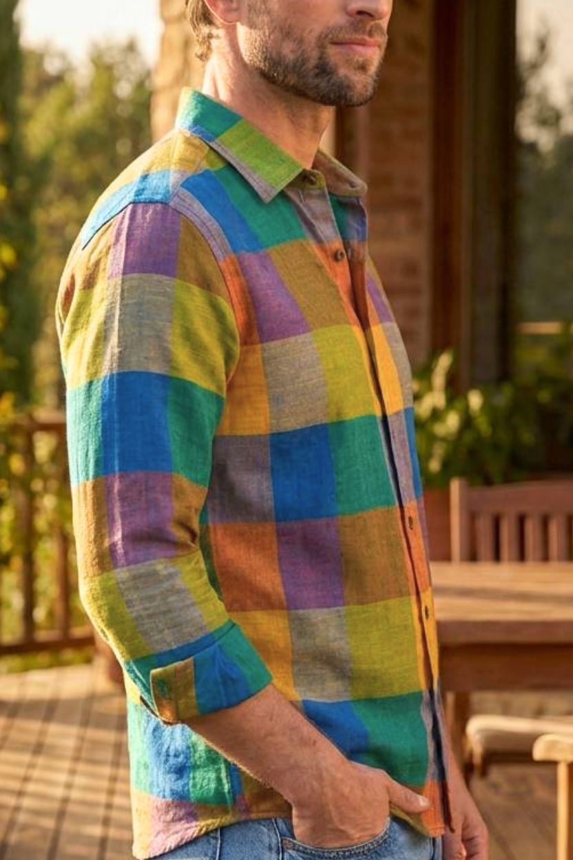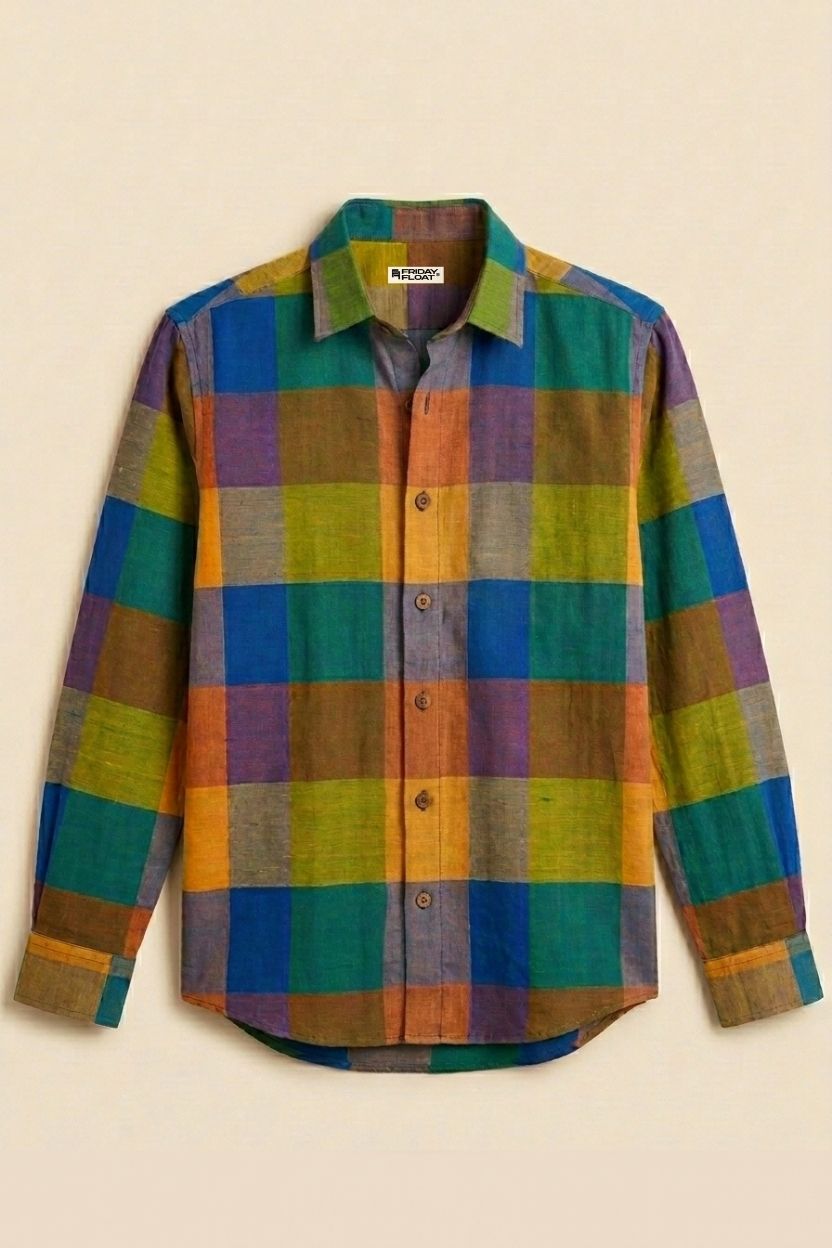 Distinctive, vibrant, and rooted in artisanal craftsmanship, this multicolor check Cotton Khadi shirt is made for those who like to express individuality through style. Handwoven from 100% pure cotton yarns, it offers exceptional breathability and a lightweight feel, making it ideal for warm-weather wear. The rich blend of earthy and vibrant tones in a bold check pattern creates a striking yet wearable aesthetic.