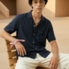 Navy Blue Linen Cuban Collar Shirt