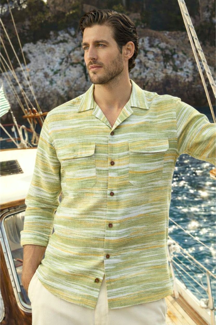 Striped Khadi Cuban Collar Shirt – Olive Yellow