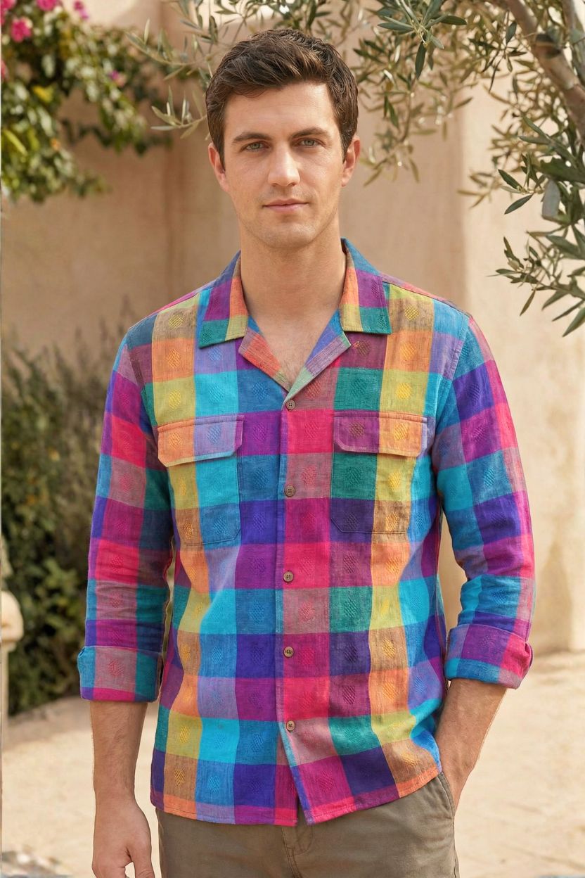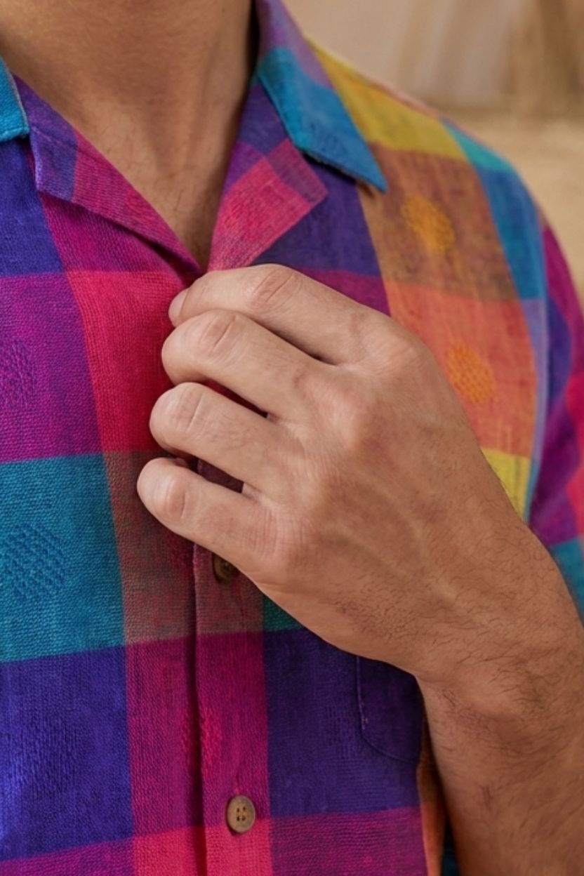 Make a bold, vibrant statement with this colorful multi-block check handloom shirt. Woven from highly breathable 100% cotton khadi, it features a lively mix of pinks, blues, yellows, and greens, complete with a classic Cuban collar, double flap pockets, and rustic wooden buttons for maximum character and flair.