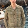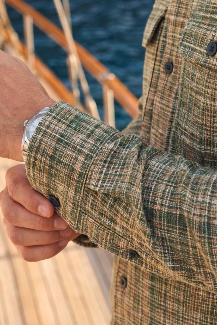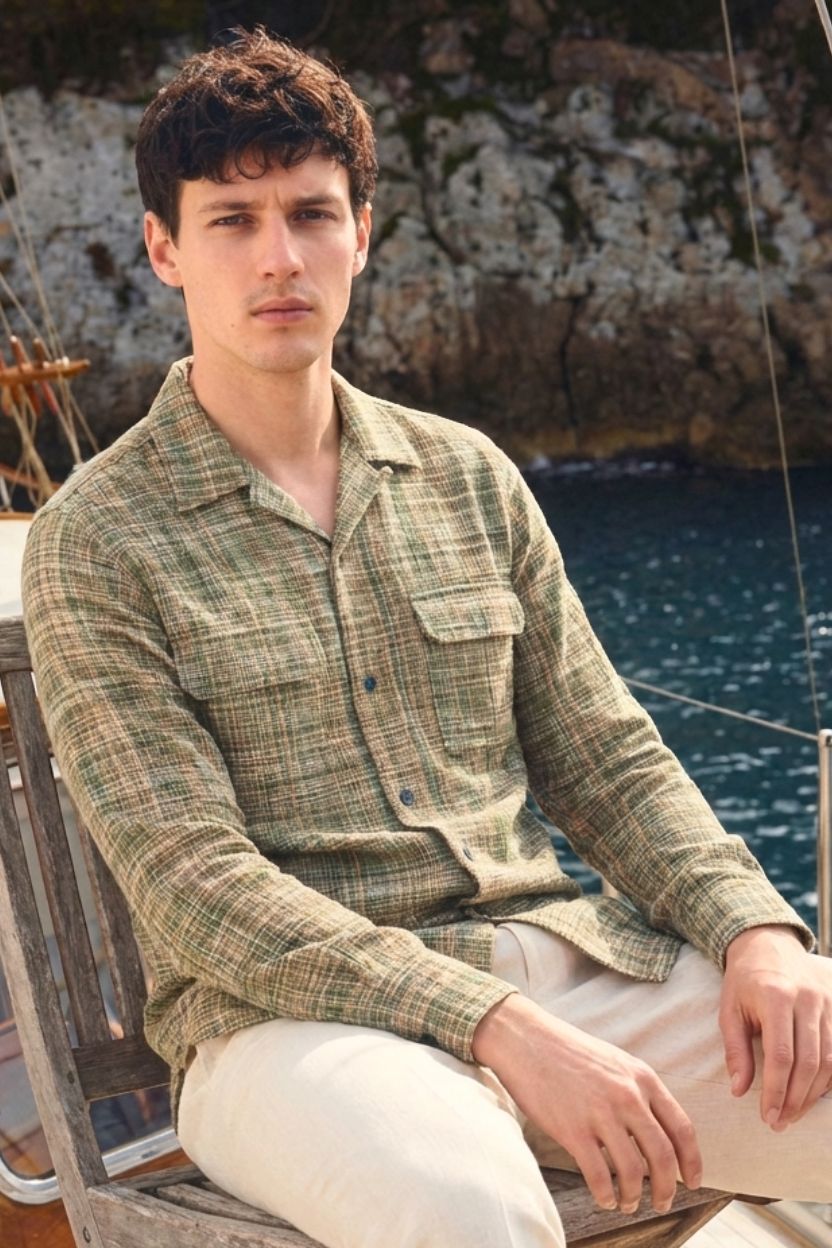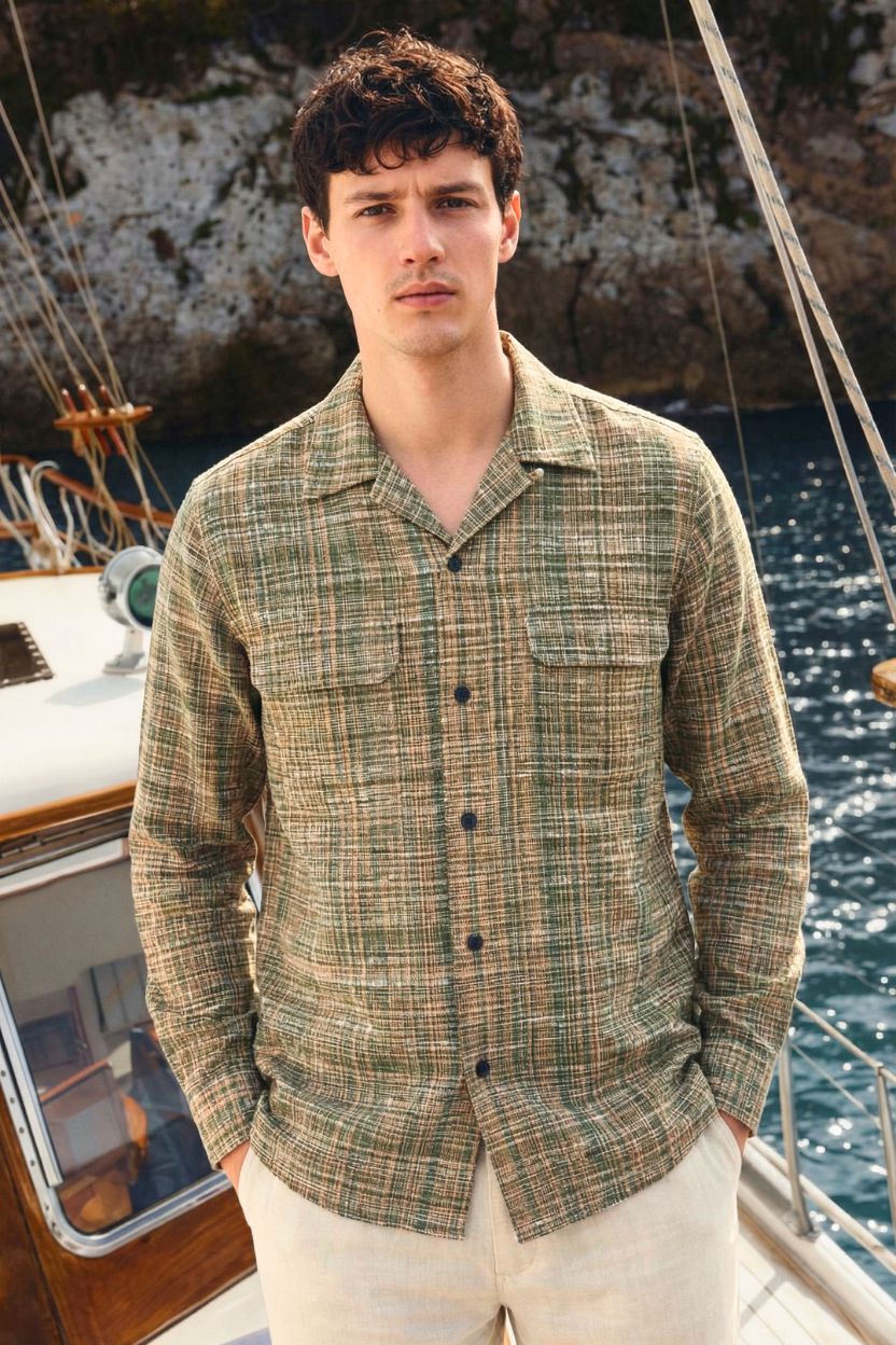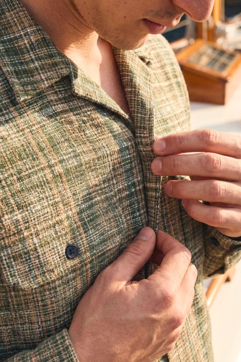 Channel nature-inspired style with this earthy olive green and tan plaid handloom shirt. Tailored with a breezy Cuban collar, functional double flap pockets, and accented with premium wooden buttons, this eco-friendly 100% cotton khadi shirt is a versatile wardrobe staple that transitions effortlessly from day to night.