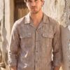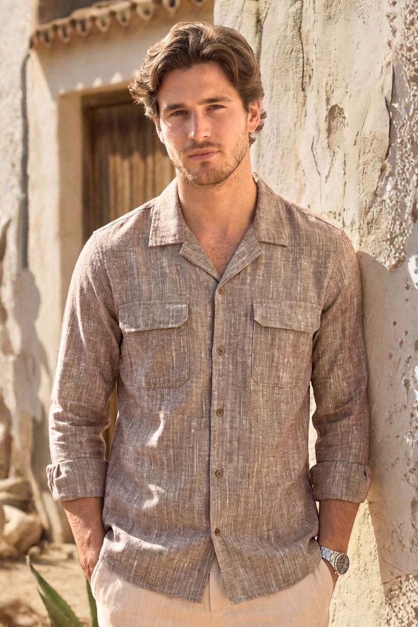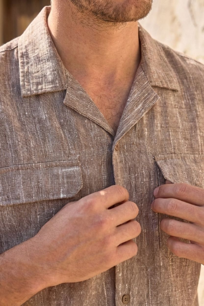 Ground your look with this sophisticated mocha brown textured handloom shirt. Ethically crafted from 100% cotton khadi, this straight-fit silhouette pairs a vintage Cuban collar and secure double flap pockets with authentic wooden buttons for a ruggedly handsome and highly versatile finish.