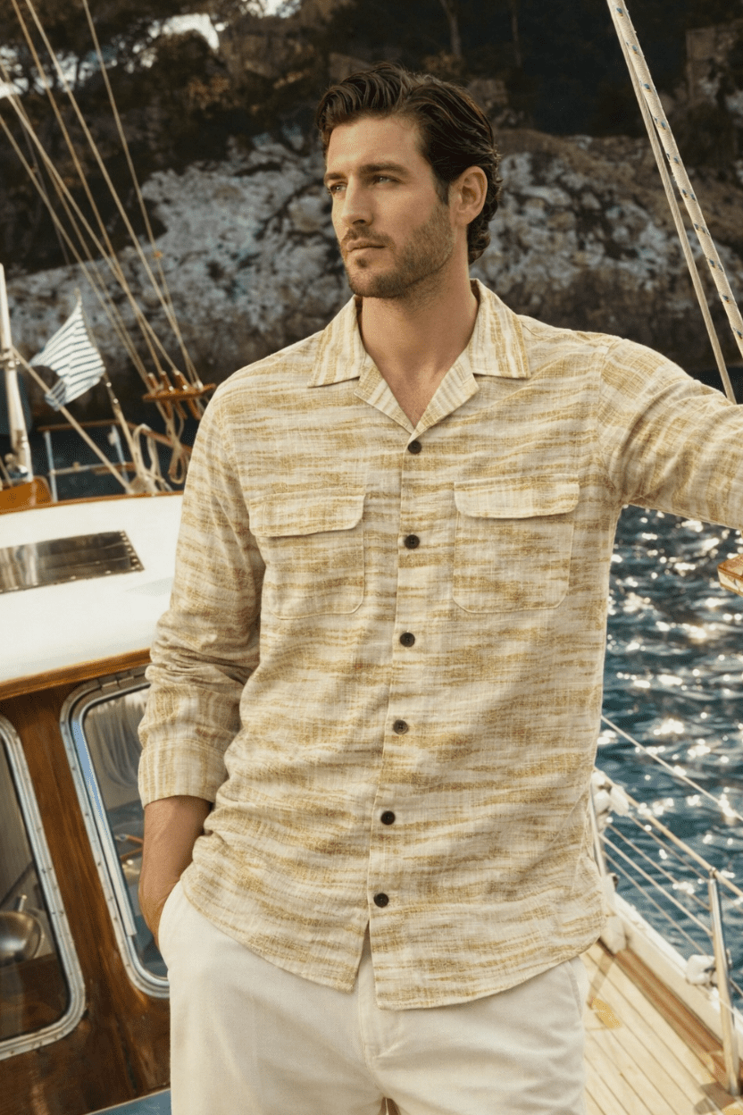 - This piece celebrates texture over noise. The subtle linear pattern gives the shirt depth without overpowering the look.
